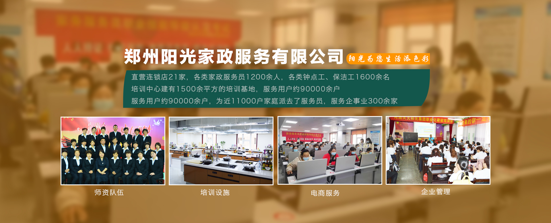 鄭州陽光家政服務(wù)有限公司成立于1998年,是鄭州市第 一家經(jīng)工商登記的家政服務(wù)企業(yè),是以家政服務(wù)、家政培訓(xùn)、社區(qū)服務(wù)、社區(qū)養(yǎng)老、托幼護(hù)理、清洗保潔為一體的社區(qū)生活服務(wù)集成商。公司有直營連鎖店21家,各類家政服務(wù)員1200余人,各類鐘點(diǎn)工、保潔工1600余名。鄭州陽光家政商學(xué)院建有1500余平方的培訓(xùn)基地,···